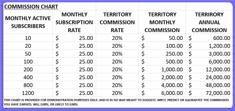 3. Independent Rep's commission rate: 20% of the monthly subscription rate charged and paid by each user that signed up / subscribed in the Independent Rep's chapter/territory.